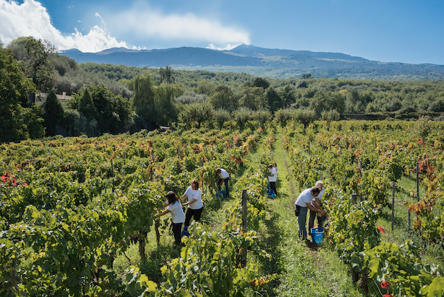 Etna, the volcano, is 10,912 ft and covers an area of 488 square miles. Mt Etna was the first Sicilian DOC named in 1968. The zone covers the northern, eastern and southern slopes of the volcano. Unlike the rest of Sicily, it has a continental climate due to altitude and cold temperatures with rain and snow in winter, mild in Spring and diurnal swings during the summer months. The soils are porous, sandy, volcanic with a huge blend of soils across the epochs from eruptions, marked with sciare (solidified ash, rocks and debris from laval flows). The traditional training systems are the albarello. The main indigenous grapes are the white carricante grape, fruity, citrus, flowers, high acidity and aromatic herbs. Nerello Mascalese, low intensity color, red fruit, balsamic, spicy, underbrush, high tannins and Nerello Capuccio, more intense in color with softer tannins. Donnafugata has vineyards in 6 different districts (contradas, crus) within 2 municipalities. In Randazzo (north-west), they have vines in Campo Ré, Statella, Montelaguardia and Calderara Sottana and then within Castiglione di Sicilia(north-central), Verzella and Marchesa, at altitudes ranging from 2000 to 2400 ft. The winery is located in the district of Statella in Randazzo.
