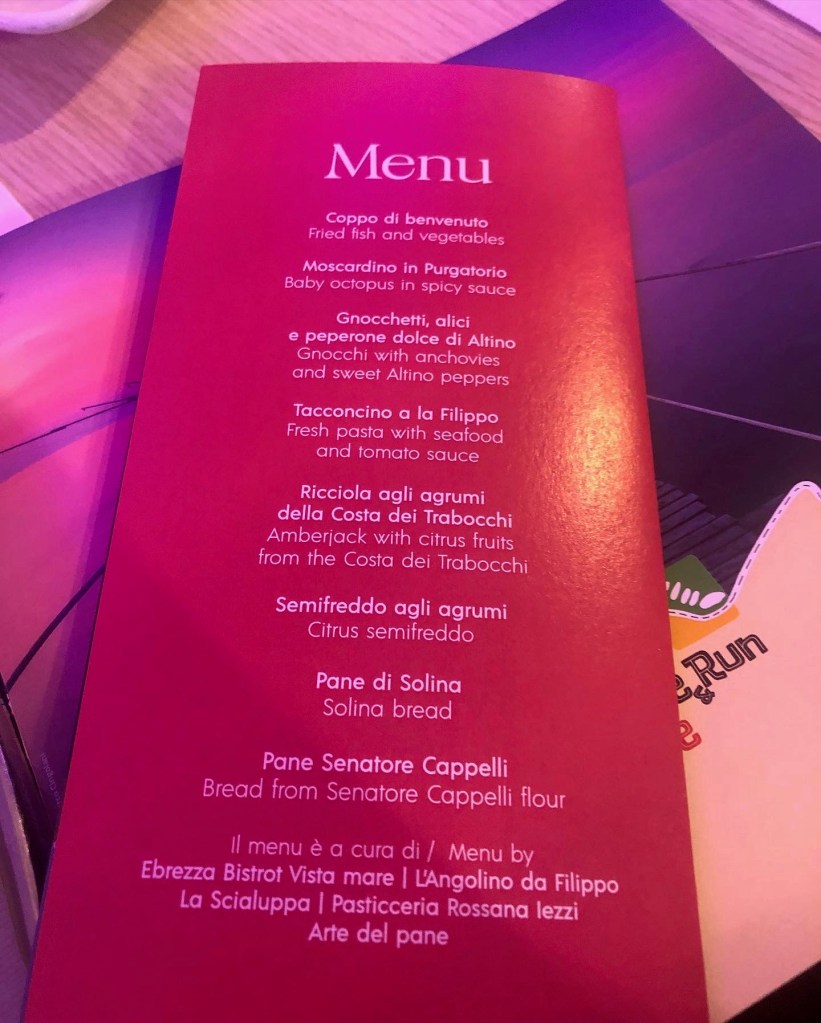 Following aperitivo hour, the groups split up to dine at restaurants nearby with set menus accompanied by more Cerasuolo wines. The colors varied slightly, based on winemaking but all the wines paired excellently with the seafood dishes.
