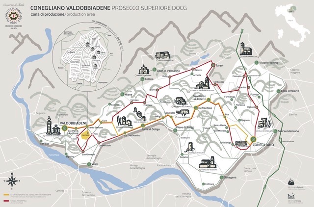 Zeroing in on where the wine regions lies, it is found in the northeast corner of the Veneto region, 50 km from Venice to the south and 100km from the Dolomite mountains in the north. The DOCG area includes 15 communes: Cison di Valmarino, Colle Umberto, Conegliano, Farra di Soligo, Follina, Miane, Pieve di Soligo, Refrontolo, San Pietro di Feletto, San Vendemiano, Susegana, Tarzo, Valdobbiadene, Vidor and Vittorio Veneto. The growing area is 8710 hectares compared to the larger Prosecco DOC of 23,300 hectares. The Prosecco DOC was established in 1969 and grew to such proportions, that the higher quality subregion of Conegliano Valdobbiadene finally gained its own DOCG status in 2009 to distinguish the quality difference and to recognize the historical growing and wine-making practices in the region.